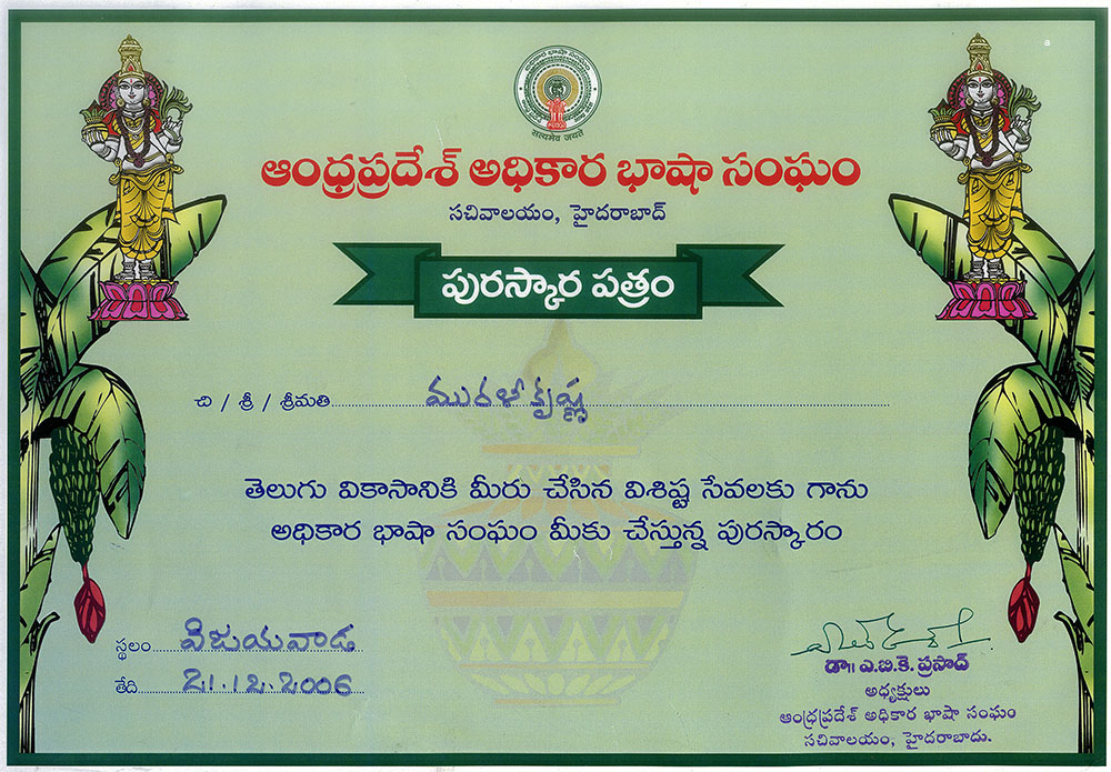 -Puraskara Patram- to S. Murali Krishna - Andhra Pradesh Adhikara Basha Sangam